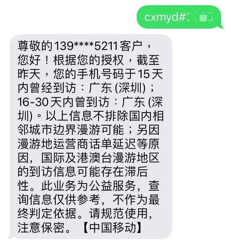 編輯短信CXMYD#身份證號碼后四位到10001,授權(quán)回復(fù)Y后,實(shí)現(xiàn)“漫游地查詢”,可查詢手機(jī)號近15日內(nèi)的途徑地信息。