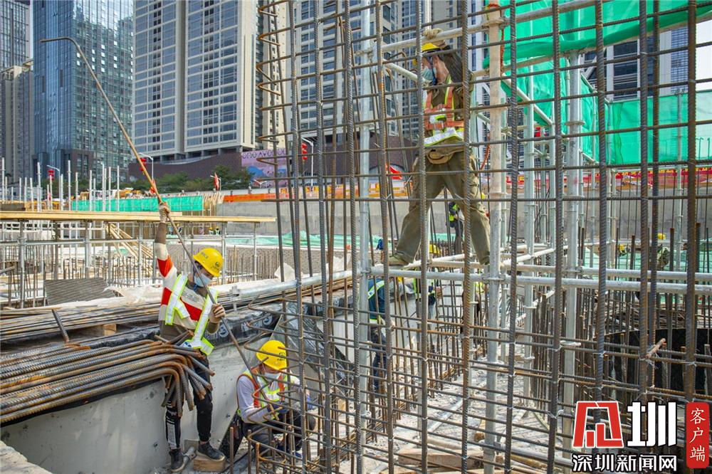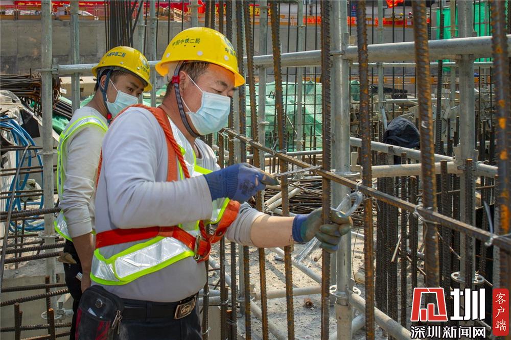 崗廈北地鐵施工工地,工人們佩戴好口罩進行施工。