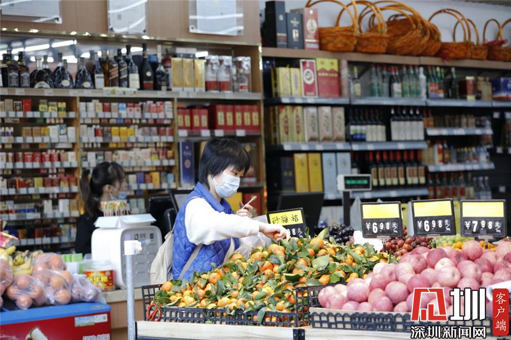 一個(gè)水果店中,一位戴著口罩的市民正在選購水果。