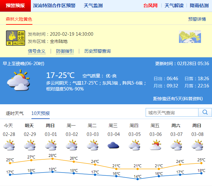 見圳客戶端·深圳新聞網(wǎng)2020年2月28日訊 深圳市氣象臺預(yù)計(jì),27日晚到28日,深圳陰天間多云,氣溫18-25 ℃,相對濕度50%-95%,東風(fēng)3-4級,沿海、高地和海區(qū)陣風(fēng)可達(dá)7級;29日至3月3日多云為主,天氣總體溫暖,氣溫小幅波動(dòng),早晚有輕霧,偶有零星小雨;4日 -5日受冷空氣影響,氣溫明顯下降,其中4日有零星小雨。