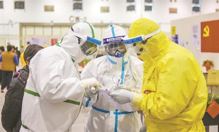 東西湖方艙醫(yī)院,深圳醫(yī)護人員與各地醫(yī)療隊員交流各項救治工作,為方艙醫(yī)院的醫(yī)療工作提供深圳經(jīng)驗。