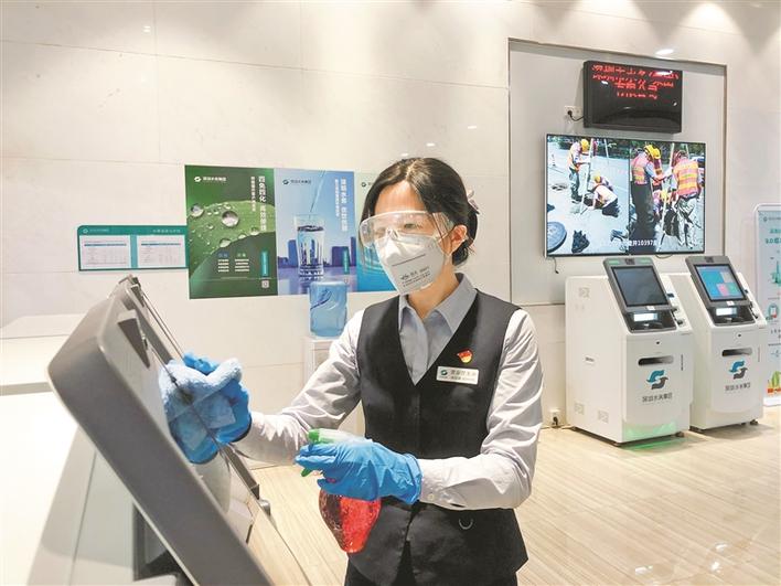 深圳水務(wù)集團(tuán)福田分公司福田營業(yè)廳的楊麗娜,正對自動服務(wù)機(jī)進(jìn)行消毒。