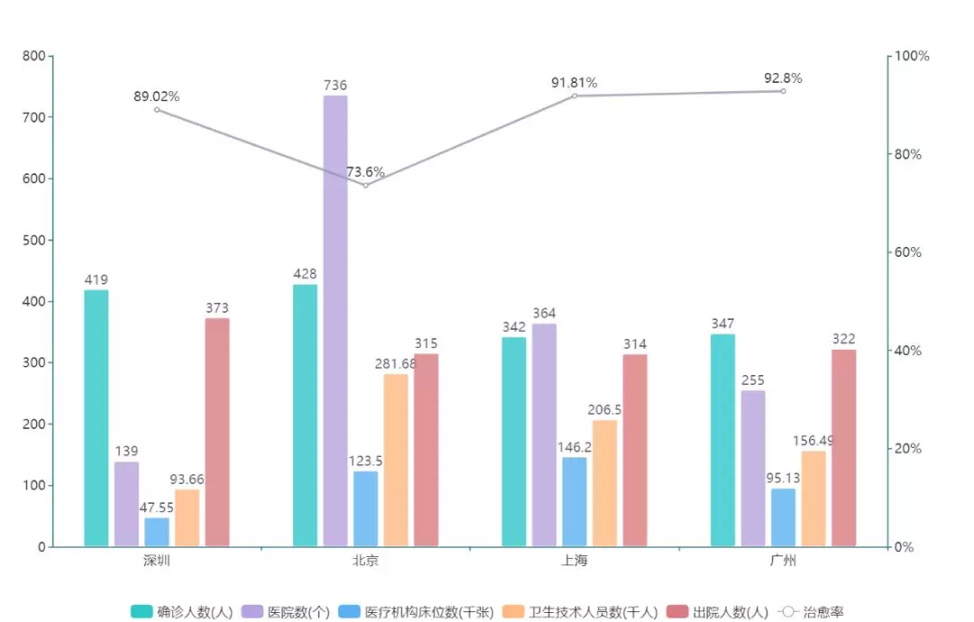 ▲對比北京、上海、廣州等城市,深圳的醫(yī)院數(shù)、床位數(shù)及衛(wèi)生技術人員數(shù)量都處在第四位,醫(yī)療資源現(xiàn)有儲備略顯不足,勢必給疫情防控過程中的患者救治工作帶來嚴峻考驗。