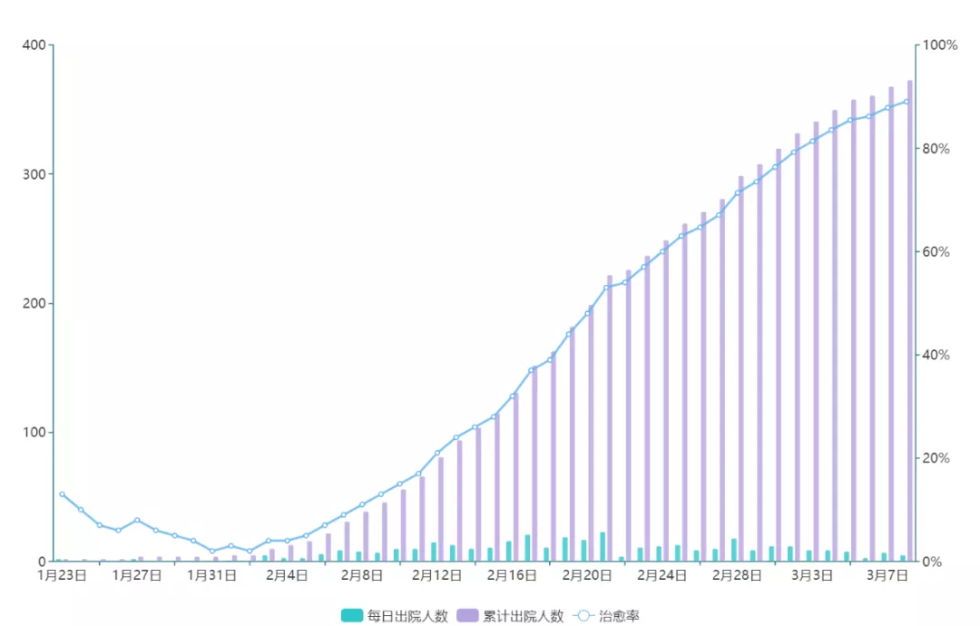 ▲目前,累計已出院373例,治愈率超過89%,高于全國(72.6%)16.4個百分點。
