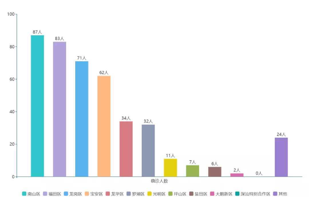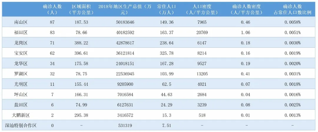 ▲按照區(qū)域劃分,已公布的確診病例中,南山區(qū)87例、福田區(qū)83例、龍崗區(qū)71例、寶安區(qū)62例,為患者較多的幾個區(qū),與其人口較多、經(jīng)濟發(fā)達有關。深汕特別合作區(qū)暫未出現(xiàn)病例。