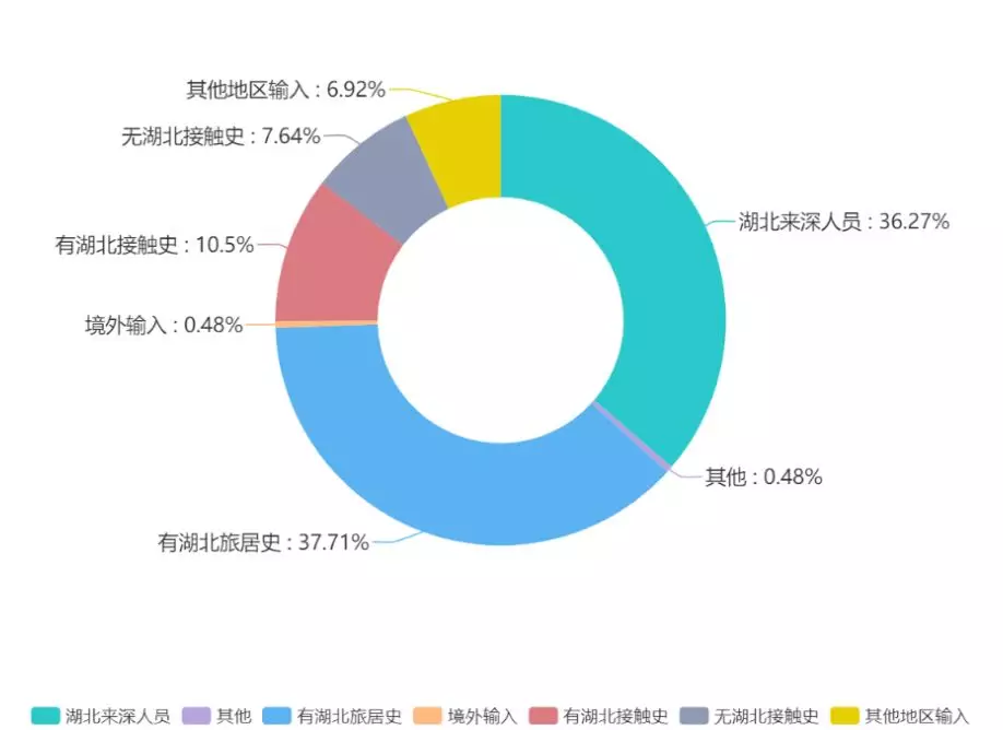▲深圳輸入型病例共計349例,占總數(shù)的83.29%。其中,湖北人員來深的輸入病例152例,占總數(shù)的36.27%;有湖北旅居史的病例158例,占總數(shù)的37.71%;境外輸入病例2例,占總數(shù)的0.48%。