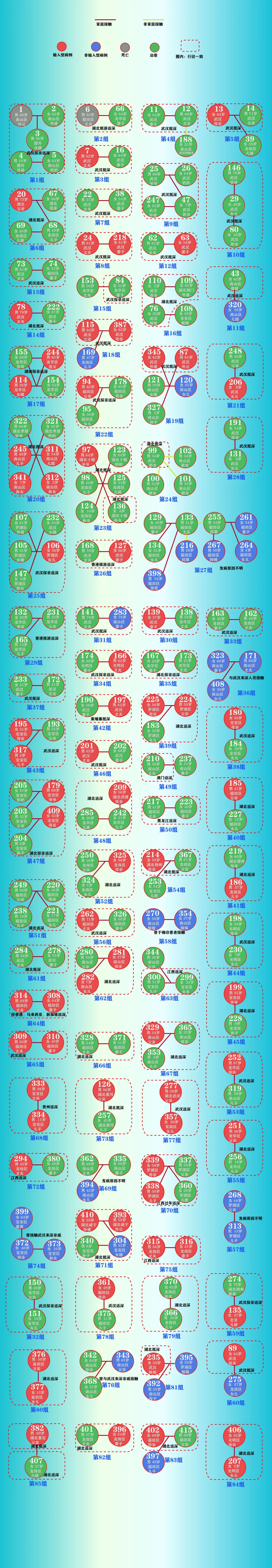 ▲多數(shù)聚集性病例以家庭聚集為主,共涉及85組病例,單個家庭確診2至3人,最多的一個家庭確診7人??梢?,在基層社區(qū)防疫力度較強的情況下,疫情擴散風險較小。但是,家庭防疫存在諸多困難,親屬間傳染風險極大。