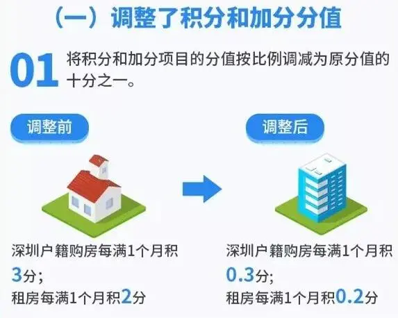 (1)深圳戶籍購房從每滿1個(gè)月積3分,調(diào)整為積0.3分;租房從每滿1個(gè)月積2分,調(diào)整為0.2分。