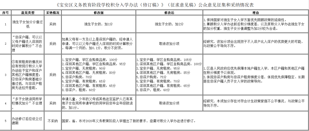 在新修訂稿中,寶安區(qū)教育局結合市民意見反饋,擬將獨生子女加分由1分調整至2分,并取消兩項加分項,同時對部分情況分值進行調整,以體現(xiàn)積分梯度。