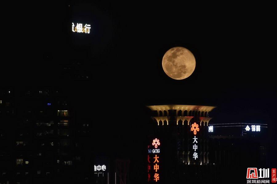 “超級月亮”出現(xiàn)在福田區(qū)上空。(圖為二次曝光)