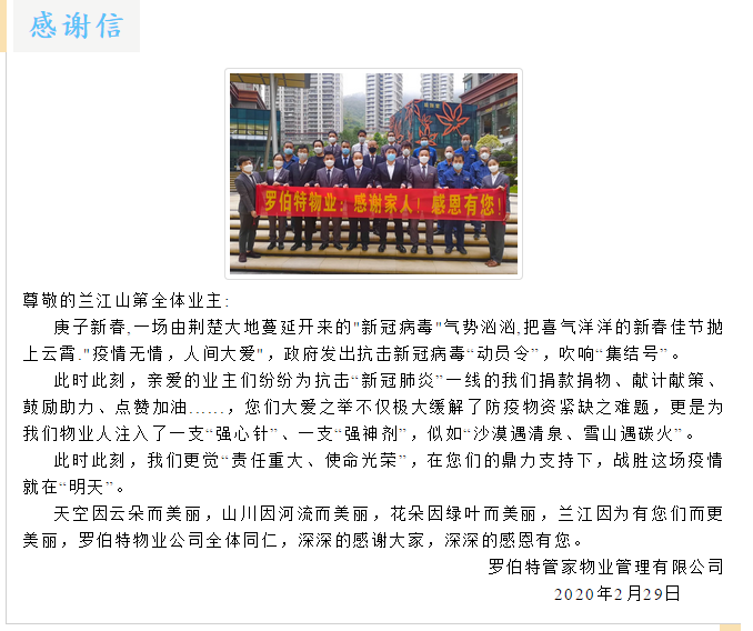 云頂尚品小區(qū)業(yè)主為了感謝物業(yè)在疫情防控期間堅守崗位,也自發(fā)組織捐款21250元為物業(yè)單位員工獻愛心,并送上寫著“疫情無情人有情,用心服務(wù)暖人心”的錦旗。