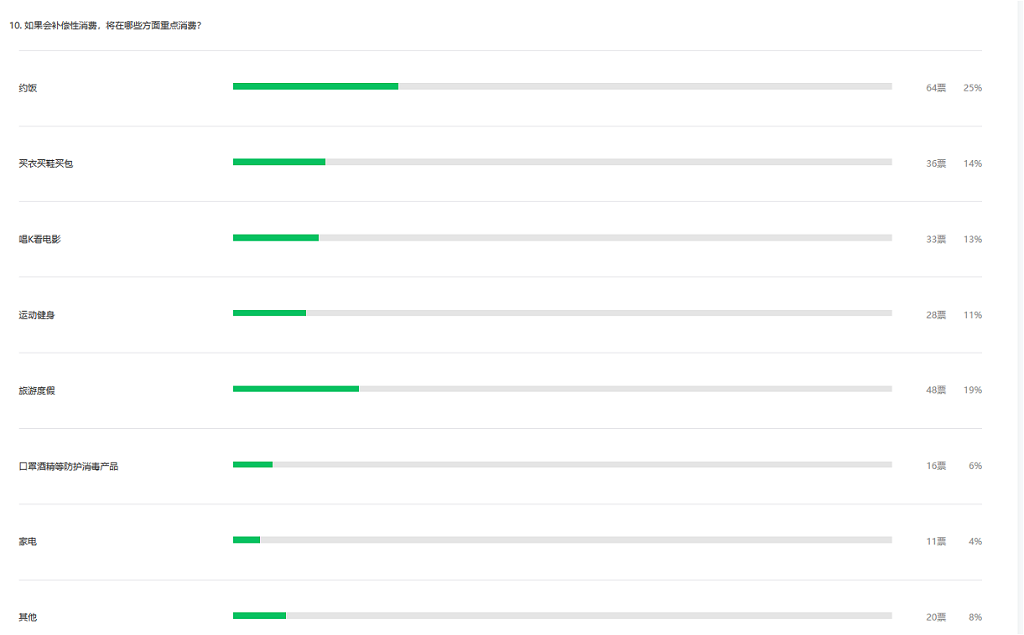 整體看,疫情對深圳市民總體消費意愿有影響。調(diào)查顯示,近四成受訪者表示疫情結(jié)束后會有補償性消費,約飯、旅游度假、買衣買鞋買包、唱K看電影以及運動健身成為疫情過后補償性消費的五大主要領(lǐng)域。