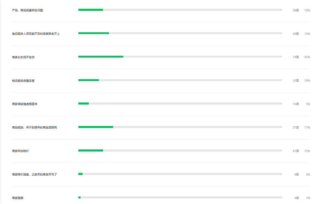 不少市民表示,疫情期間“在線消費”遇到過問題。其中,長時間不發(fā)貨、因商品短缺或限購買不到商品、售后服務(wù)人員回復不及時或聯(lián)系不上位列市民消費不滿意榜前三;而商品質(zhì)量存在問題、商家哄抬物價則并列消費不滿意榜第四。