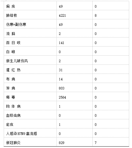 其中,甲類傳染病無(wú)報(bào)告,乙類傳染病甲類管理的新冠肺炎報(bào)告病例829例。乙類除傳染性非典型肺炎、脊髓灰質(zhì)炎、人感染高致病性禽流感、狂犬病、炭疽、乙腦、白喉、血吸蟲病、人感染H7N9禽流感無(wú)發(fā)病、死亡報(bào)告外,其余18種傳染病均有病例報(bào)告。