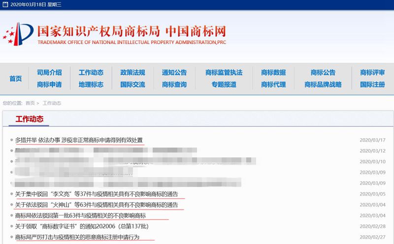 從2月27日到3月17日,商標(biāo)局工作動(dòng)態(tài)有5條和涉疫非正常商標(biāo)申請(qǐng)有關(guān)(劃紅線處)
