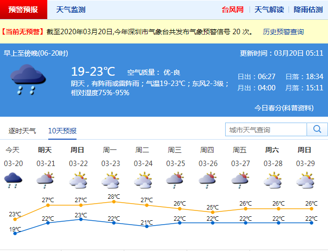 據深圳氣象臺預報,20日有雷陣雨,局部大雨,氣溫19-23℃;21日降雨結束。21-24日溫暖濕潤,早晚有輕霧或霧;25-26日有雷陣雨。