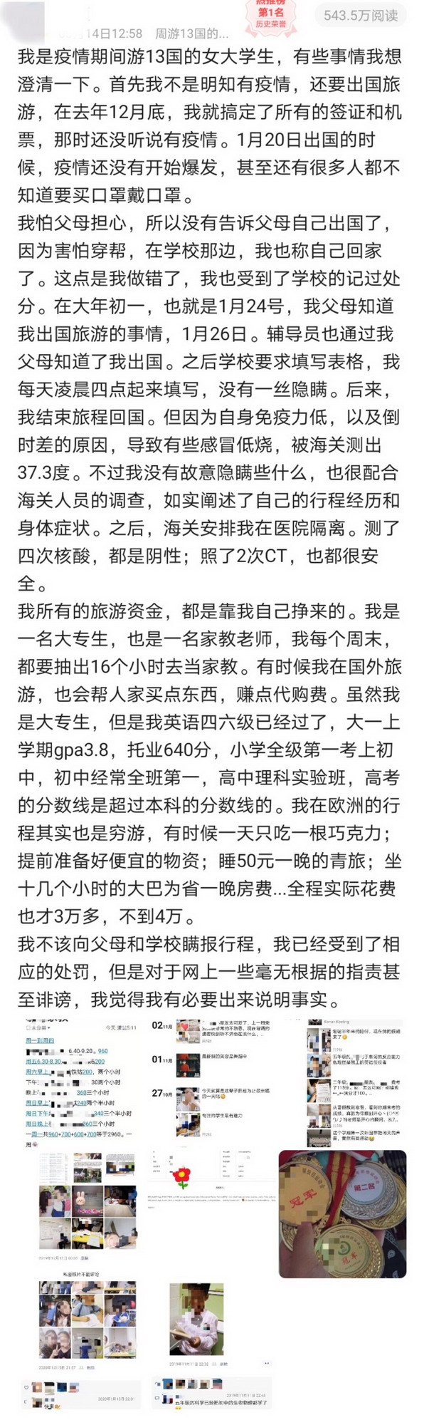 記者從小Y處了解到,1月20日,她出發(fā)開始旅行并于3月3日從珠海入境回國(guó),期間共游玩13個(gè)國(guó)家。“10月份就已經(jīng)決定出去玩,11月一直在準(zhǔn)備簽證,12月中旬簽證什么的都已經(jīng)準(zhǔn)備好了?!庇捎诤ε赂改笓?dān)心她一人在外旅行的安全問題,出發(fā)時(shí)并沒有告知父母?!?月23日,學(xué)校要求所有學(xué)生填寫一個(gè)假期所在地,我填寫的是‘在家’,因?yàn)椴幌胱尲依锶酥牢以趪?guó)外,害怕穿幫。出發(fā)時(shí)國(guó)內(nèi)疫情還沒有爆發(fā),所以不是很清楚國(guó)內(nèi)的疫情,也沒想到填這個(gè)信息是為了防控疫情所用,所以沒有如實(shí)填寫。大年初一,也就是1月24日,我父母知道了我出國(guó)的事,對(duì)我嚴(yán)厲批評(píng)。之后學(xué)校要求填寫表格,我沒有隱瞞,都是如實(shí)填寫。”