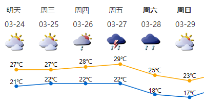 24-25日多云,早晚能見(jiàn)度較低,24日氣溫21-27℃;