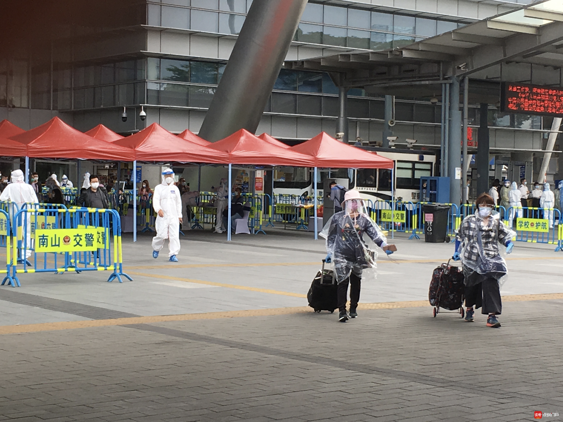 在入境廳東側(cè),停有兩排大巴,大巴前均放有該車通往目的地的指示牌。記者看到,持護照的旅客在入境大廳門口接受分類指引,掃碼后填寫前往城市,領(lǐng)取乘車憑證,穿白色防護服的工作人員還會帶引旅客到指定大巴,由大巴免費送往目的地或酒店醫(yī)學(xué)觀察點。“一個人上車就可以走,不用怎么等?!饼垗徿囮爭煾蹈嬖V記者,旅客上車后會及時發(fā)車,將他們帶離口岸。