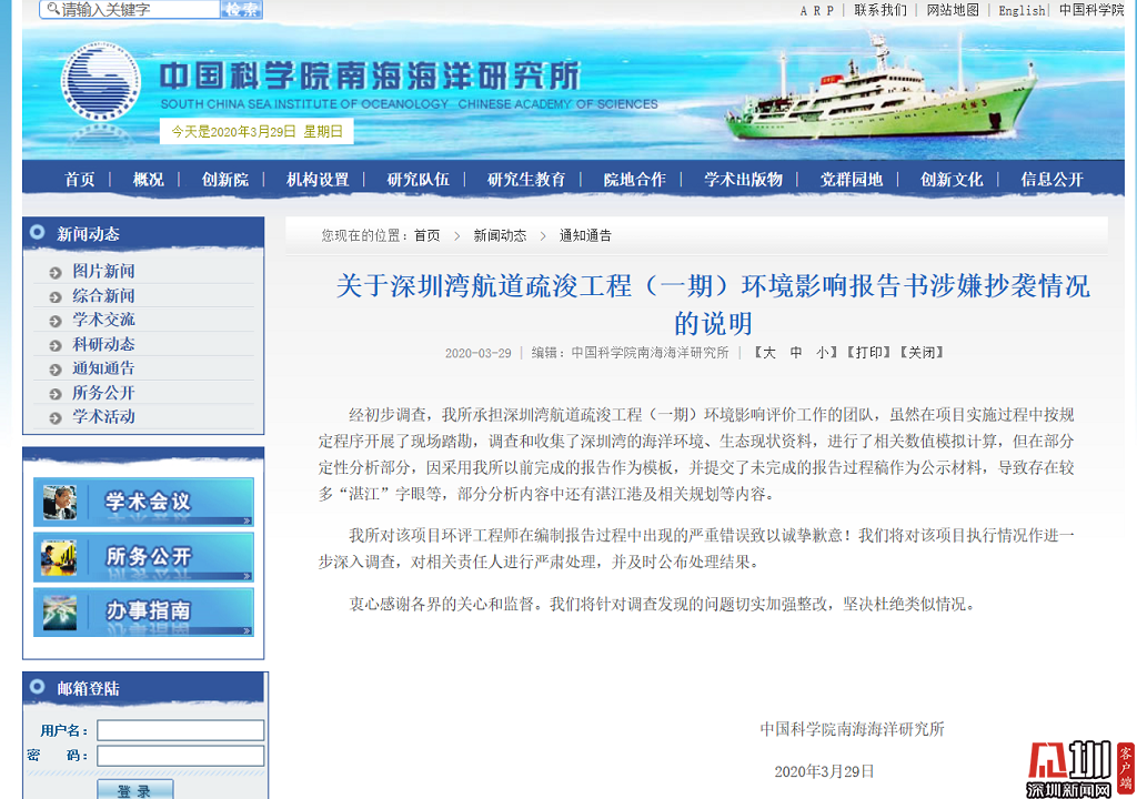 見圳客戶端·深圳新聞網(wǎng)2020年3月29日(見圳客戶端、深圳新聞網(wǎng)記者 鐘鴻冰)3月29日,中國科學(xué)院南海海洋研究所在官網(wǎng)發(fā)布說明稱:深圳灣航道疏浚工程(一期)環(huán)境影響評價工作雖按規(guī)定進行了現(xiàn)場踏勘,調(diào)查并收集了有關(guān)資料等環(huán)節(jié),但因采用其以前的報告作為模板,并將未完成的報告作為公示材料,導(dǎo)致公示的環(huán)評報告中出現(xiàn)多處錯誤。南海海洋研究所表示,將對相關(guān)責(zé)任人嚴肅處理并公示處理結(jié)果。