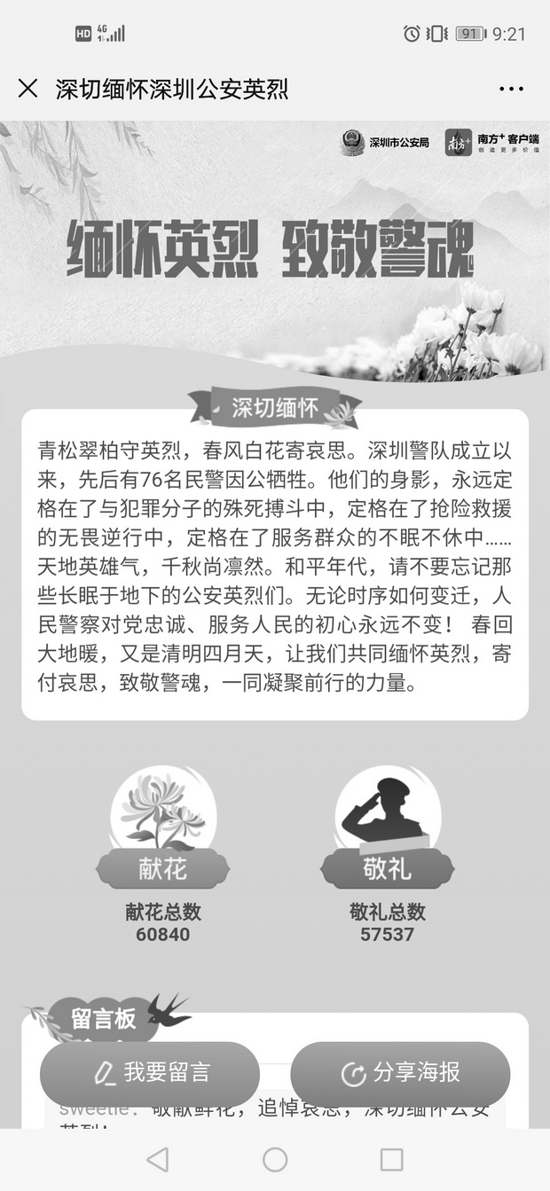 據(jù)介紹,鑒于當(dāng)前疫情防控形勢(shì),市公安局不組織集體祭掃活動(dòng),通過(guò)公安內(nèi)網(wǎng)、互聯(lián)網(wǎng)等網(wǎng)絡(luò)開(kāi)設(shè)“緬懷英烈”專欄開(kāi)展“網(wǎng)上祭掃”活動(dòng),市民群眾可點(diǎn)擊深圳公安微信公眾號(hào),向公安英烈獻(xiàn)花、留言,寄托哀思,致敬警魂。