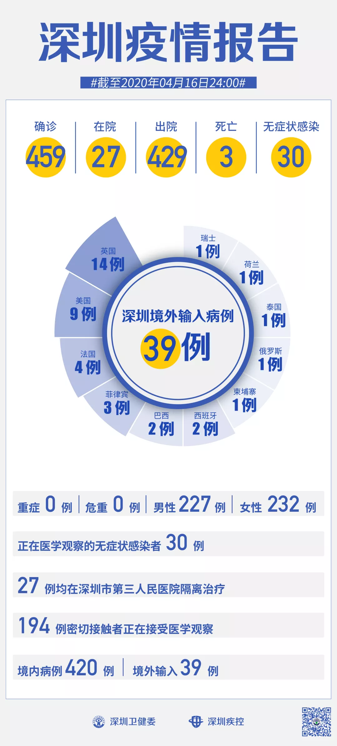 截至4月16日24時(shí),深圳累計(jì)報(bào)告新冠肺炎病例459例。4月16日當(dāng)天新增境內(nèi)病例1例,新增無(wú)癥狀感染者1例。