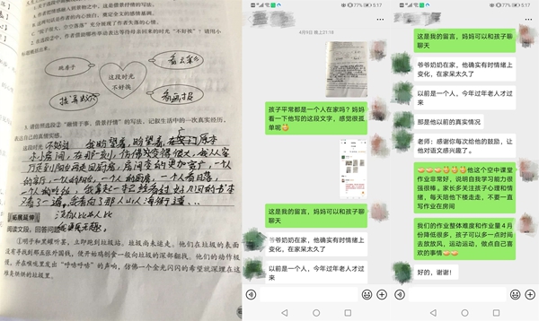 疫情來(lái)的迅猛又猝不及防,老師們一方面要完成教學(xué)任務(wù)、引導(dǎo)學(xué)生做好防疫,一方面要時(shí)刻關(guān)注學(xué)生的心理健康。學(xué)生們被迫在家度過(guò)了一個(gè)史上最長(zhǎng)的寒假,對(duì)于處在叛逆期的孩子們來(lái)說(shuō),難免會(huì)與家人出現(xiàn)一些矛盾,在課堂之外,老師們還需要擔(dān)任“心理調(diào)節(jié)師”的角色。一次,周老師班上有個(gè)同學(xué)因?yàn)樯暇W(wǎng)課的事情與父母鬧了矛盾,一氣之下跑到奶奶家,周老師得知了這件事情,第一時(shí)間聯(lián)系上學(xué)生,通過(guò)鼓勵(lì)、引導(dǎo),讓學(xué)生認(rèn)識(shí)到自己的錯(cuò)誤,與父母和解。還有一次,周老師通過(guò)批改作業(yè),發(fā)現(xiàn)一名學(xué)生在作業(yè)中吐露了自己孤獨(dú)、無(wú)趣的心聲??吹胶螅芾蠋熈⒖膛c家長(zhǎng)溝通了解情況,并建議家長(zhǎng)多多陪伴孩子。盡管老師和學(xué)生們不能在學(xué)校的課堂上相聚,但在通訊十分發(fā)達(dá)的現(xiàn)在,老師們也始終用自己的方式陪伴在學(xué)生左右。