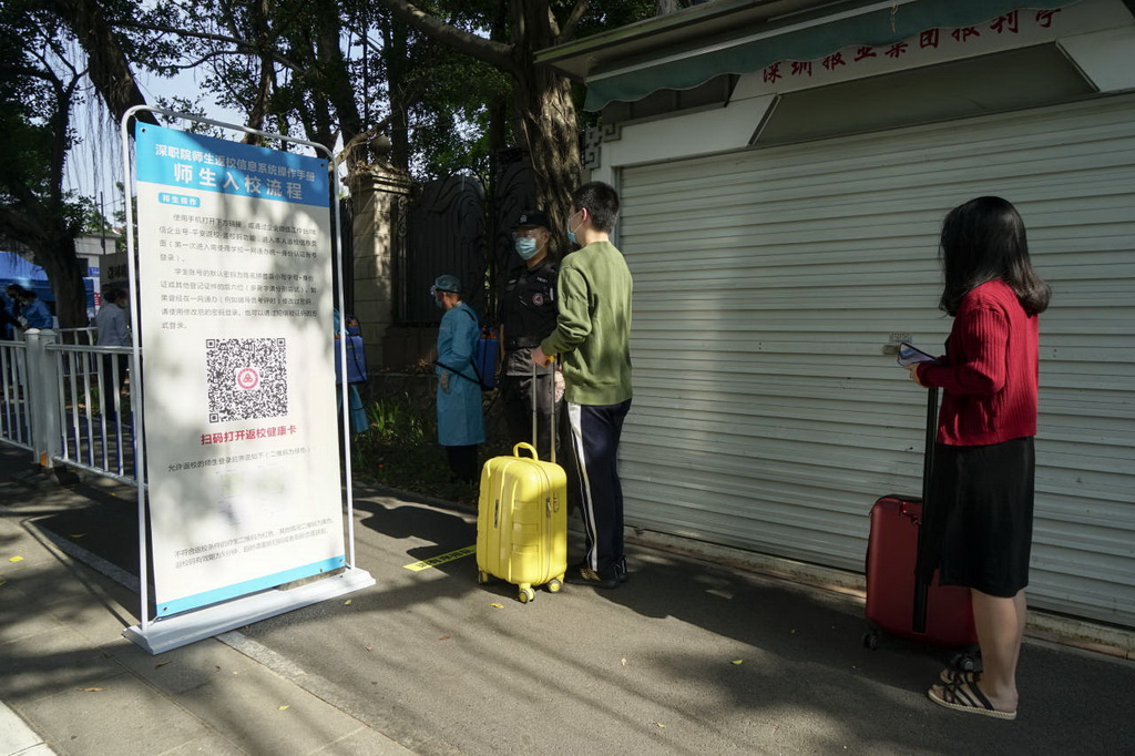 帶行李箱的學(xué)生走專(zhuān)用通道,依次完成掃碼核驗(yàn)、測(cè)量體溫等流程后進(jìn)入校園。
