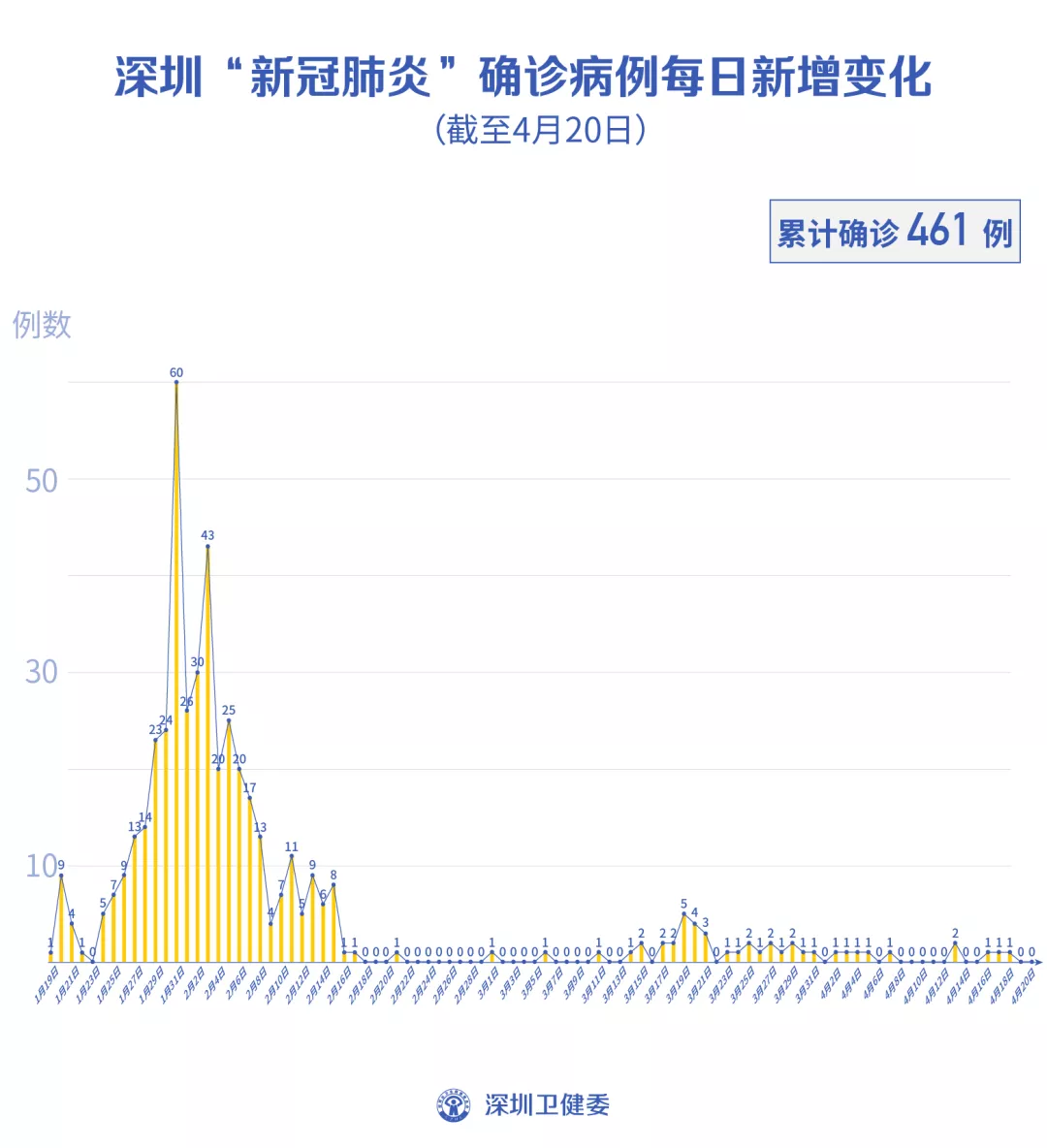 截至4月20日24時,深圳累計報告新冠肺炎病例461例。4月20日當天新增出院1例。