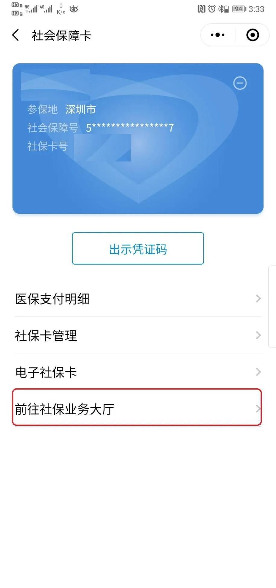 2、添加后點擊進入“社會保障卡”—“前往社保業(yè)務(wù)大廳”;