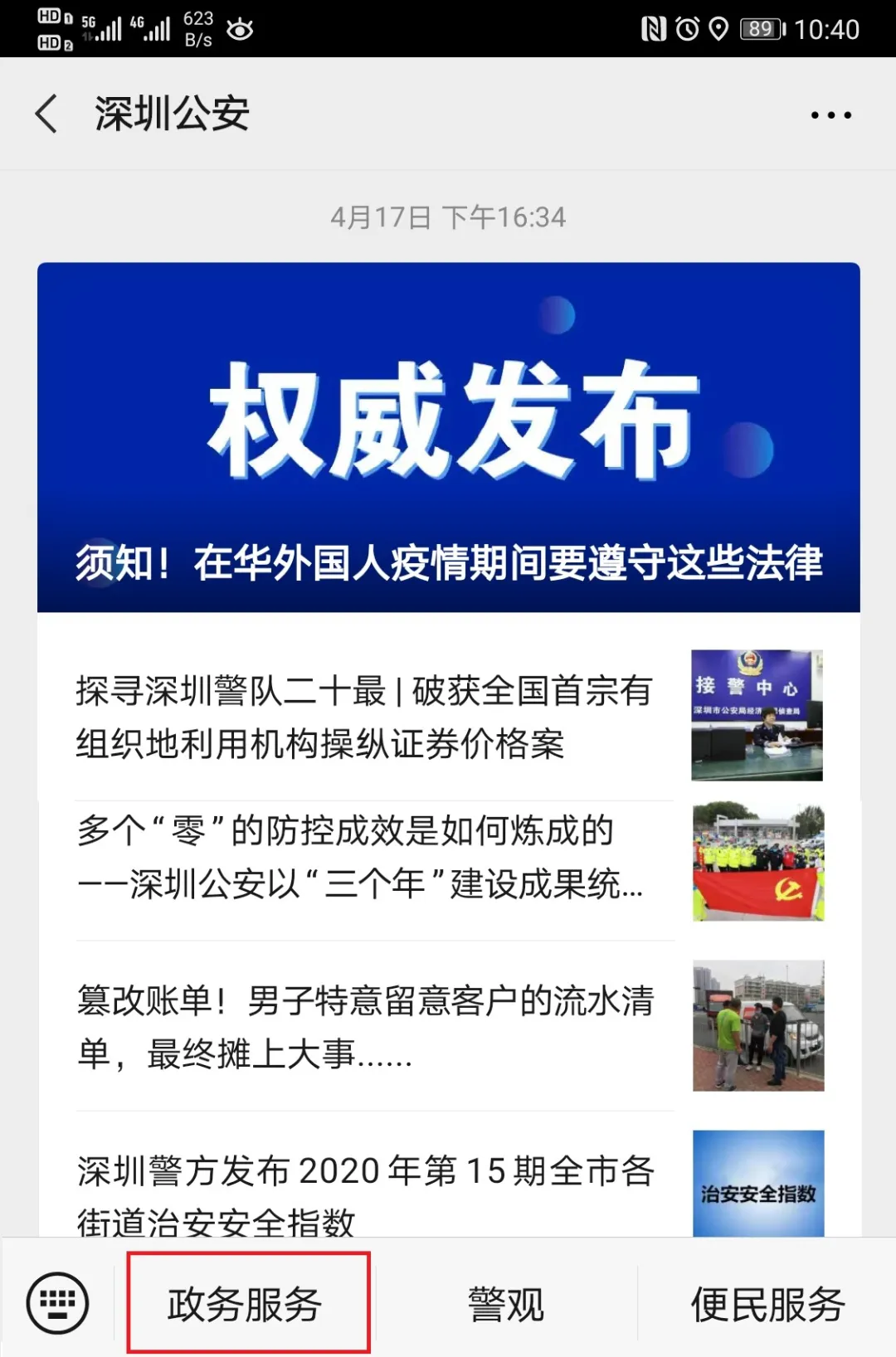 1、關(guān)注“深圳公安”,點擊“政務(wù)服務(wù)”;