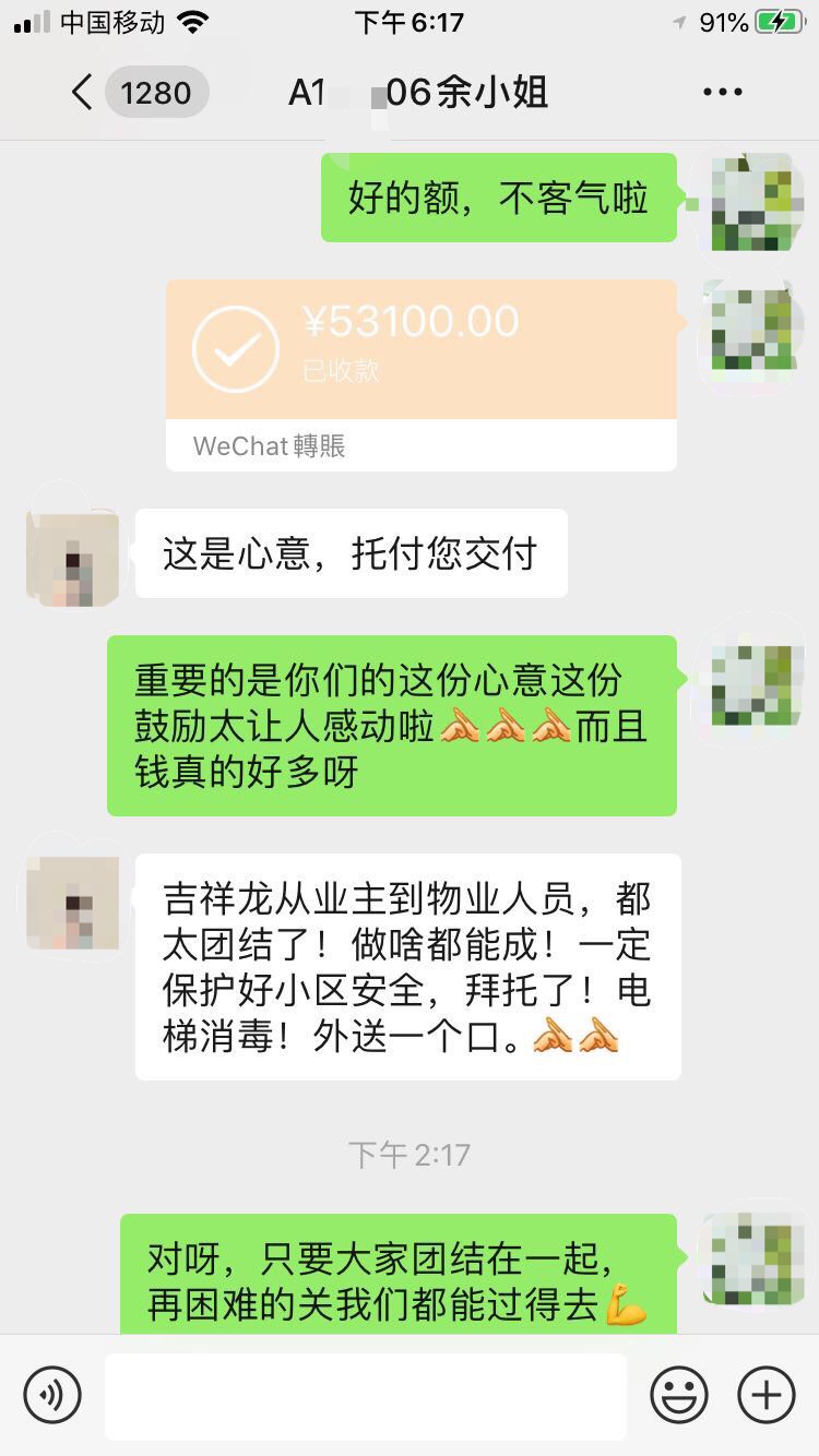 一天下來(lái),吉祥龍小區(qū)共有156位愛(ài)心業(yè)主通過(guò)線上籌集款項(xiàng)53100元,最后以微信轉(zhuǎn)賬的形式轉(zhuǎn)給了吉祥龍小區(qū)服務(wù)中心負(fù)責(zé)人張經(jīng)理,并委托其轉(zhuǎn)交給堅(jiān)守在工作崗位的每一位物業(yè)員工手中。