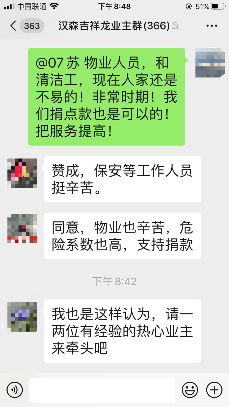 原來(lái),吉祥龍小區(qū)業(yè)主因?yàn)橛X(jué)得物業(yè)一線工作人員抗戰(zhàn)疫情工作危險(xiǎn)又更辛苦,便在微信群內(nèi)發(fā)起了給本小區(qū)物業(yè)人員捐款的倡議,收到了眾多業(yè)主的熱烈反響?!百澇?,保安等工作人員挺辛苦”、“同意,物業(yè)也辛苦,危險(xiǎn)系數(shù)也高,支持捐款”……業(yè)主們通過(guò)討論,約定好捐贈(zèng)方式全憑自愿、不搞強(qiáng)制、不論數(shù)額、謹(jǐn)表心意。短短一小時(shí),捐贈(zèng)金額就達(dá)到了3萬(wàn)余元。業(yè)主余小姐表示,吉祥龍小區(qū)業(yè)主和物業(yè)人員在防疫過(guò)程中正團(tuán)結(jié)一心、關(guān)系緊密,一定能保護(hù)好小區(qū)安全。