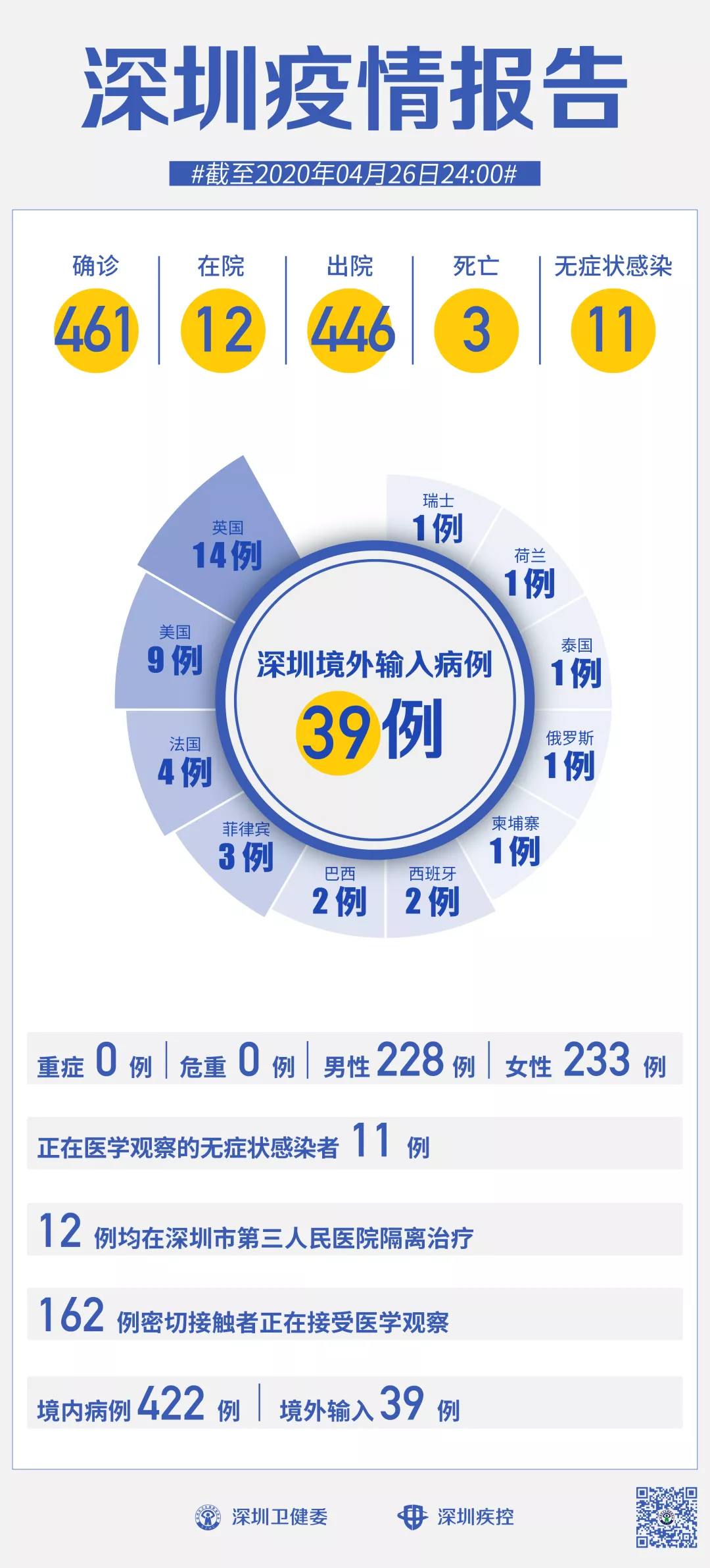 截至4月26日24時(shí),深圳累計(jì)報(bào)告新冠肺炎病例461例。