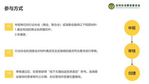 申請(qǐng)通過(guò)后,經(jīng)營(yíng)者即可獲得“線下無(wú)理由退貨承諾店”稱號(hào),具體參與方式見(jiàn)下圖。