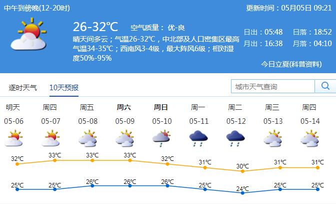 見(jiàn)圳客戶(hù)端·深圳新聞網(wǎng)2020年5月5日訊 深圳市氣象臺(tái)預(yù)計(jì),5日我市晴天間多云,氣溫25℃-32℃,中北部和人口密集區(qū)最高氣溫34℃-35℃;6-9日多云間晴天,天氣炎熱,午后局地有熱雷雨;10-11日受冷空氣影響,有雷陣雨。