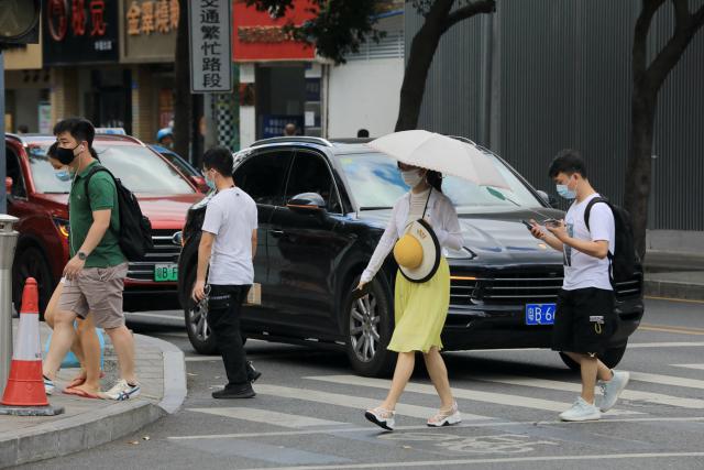 ▲走在街上,熱浪撲面而來(lái),耀眼的陽(yáng)光把人曬得睜不開(kāi)眼,行人紛紛拿起手頭物品遮擋烈日。