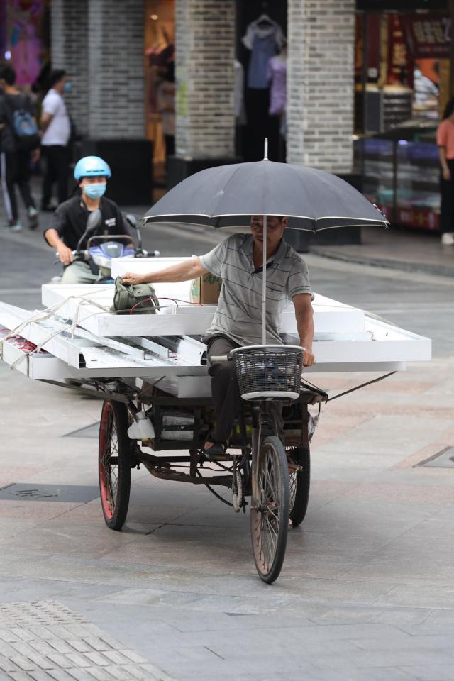 ▲市民在電動(dòng)車(chē)、三輪車(chē)上支起防曬傘。