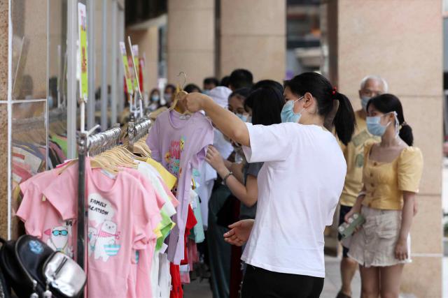 ▲夏季服裝開(kāi)售,不少商家打折促銷(xiāo),吸引市民選購(gòu)。