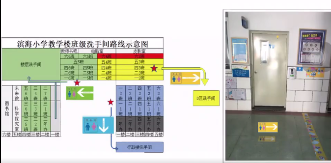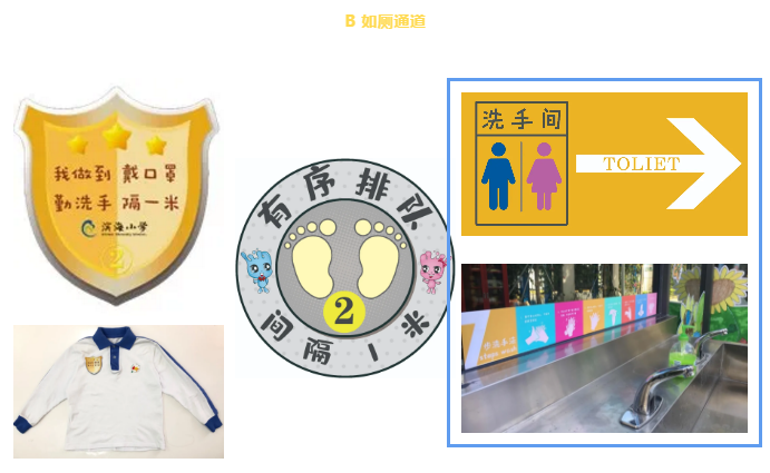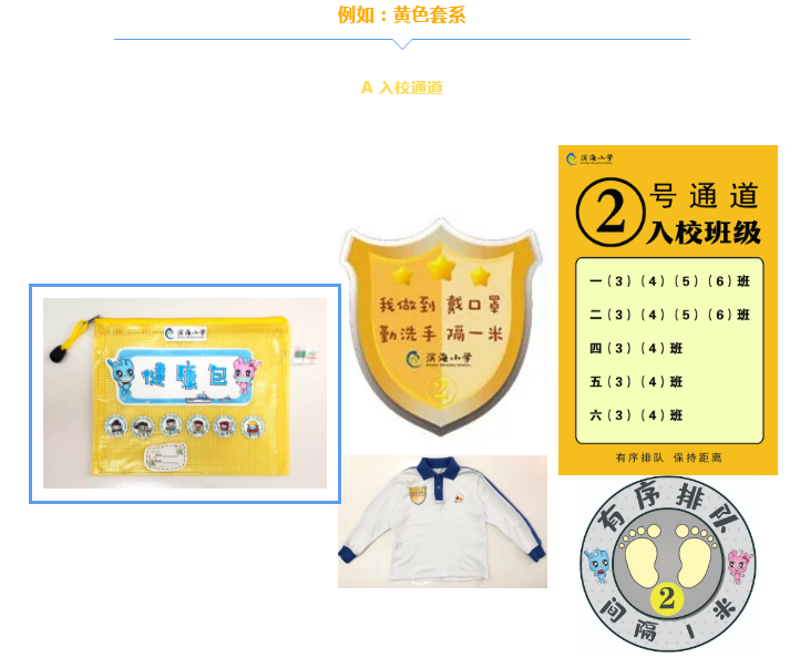 學(xué)校將教學(xué)區(qū)劃分為“綠黃藍(lán)”三區(qū),并精心設(shè)計(jì)了帶有濱海元素的“三色”入校通道、三色盾牌、三色貼紙等!