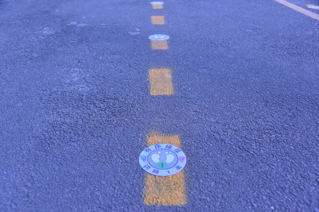 校門口還設(shè)置了,入校緩沖區(qū),家長(zhǎng)止步區(qū),三色地貼!請(qǐng)家長(zhǎng)們止步!孩子們可以循著地貼,走向?qū)儆谧约旱纳释ǖ溃?/p>