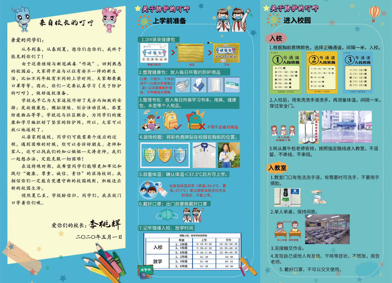針對(duì)即將返校的學(xué)生,還有一份特別的《叮嚀》,來自李桃輝校長(zhǎng)《愛的叮嚀》,這里有桃輝校長(zhǎng)的暖心留言,還有幫助孩子們適應(yīng)全然不同的校園新生活的各種說明!
