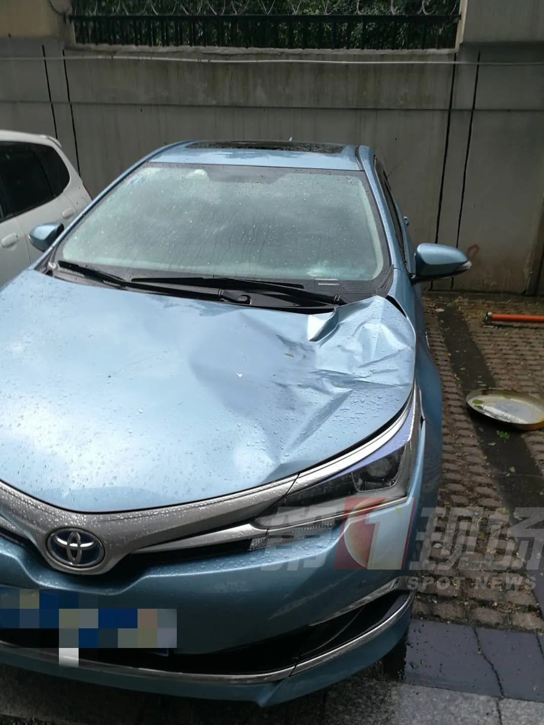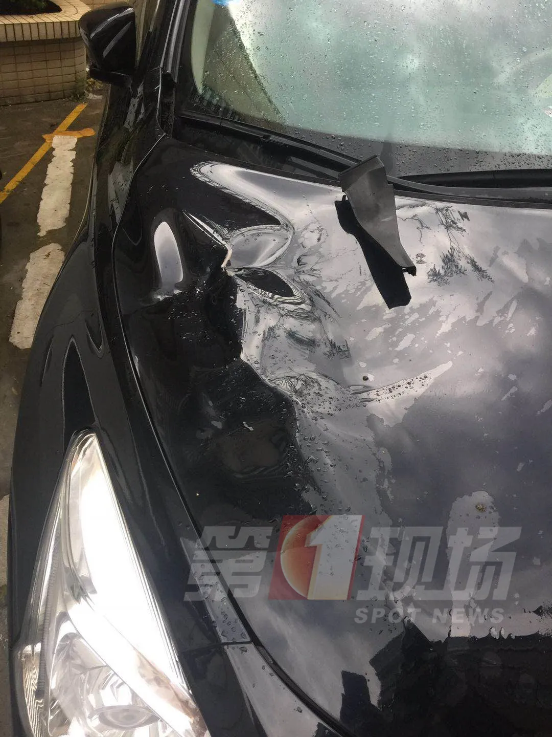 其中,龍華民治春華四季園42棟高層的儲水箱,砸到了樓下藍色轎車,造成車輛發(fā)動機蓋一處凹陷,多處刮痕。