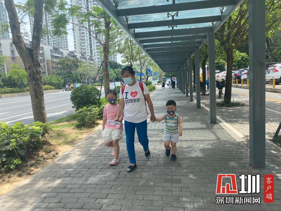 正午時(shí)分,兩位小朋友隨家人外出,三人均佩戴口罩。