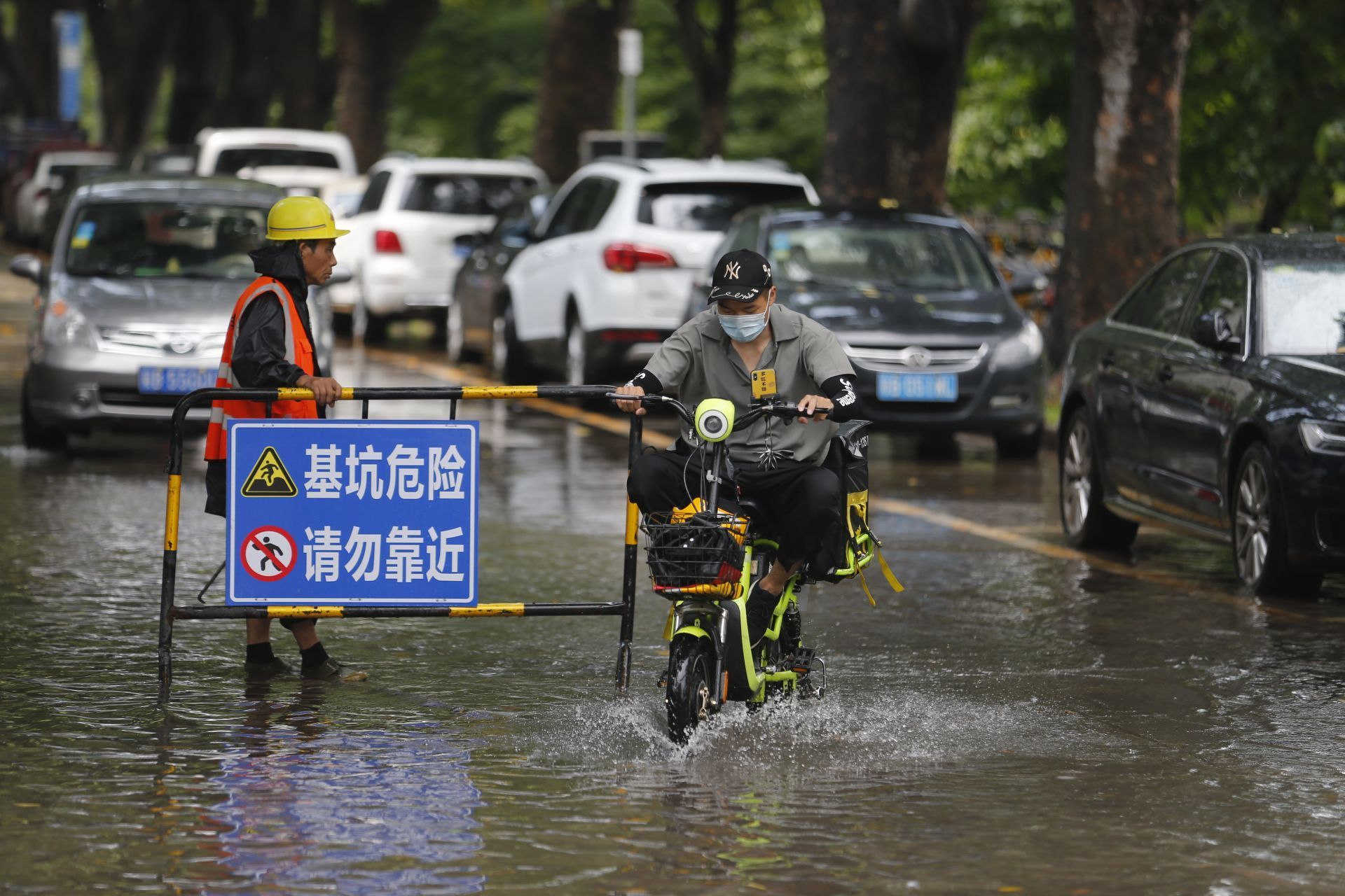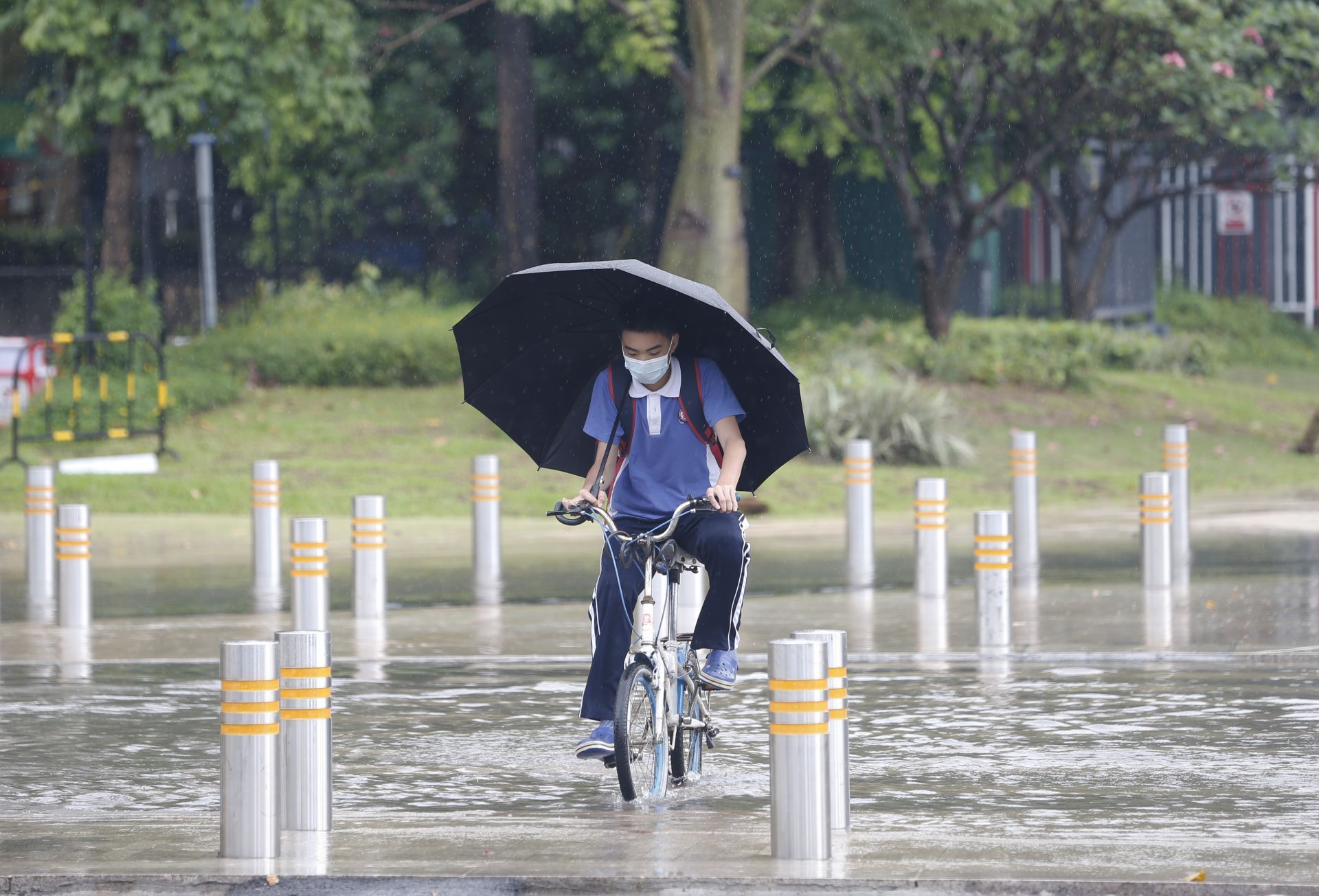 2020年5月26日中午13:46分,商報東二路,短時強降水導致路面水浸,一位騎士經(jīng)過水浸路面。