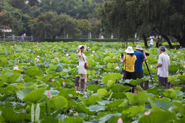 ▲眾多市民、游客來到公園觀賞荷花。