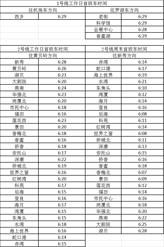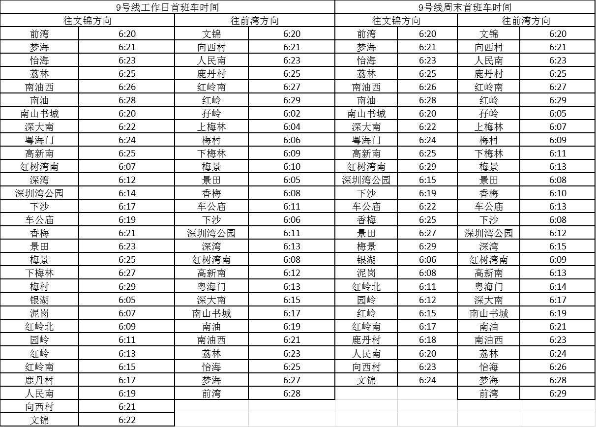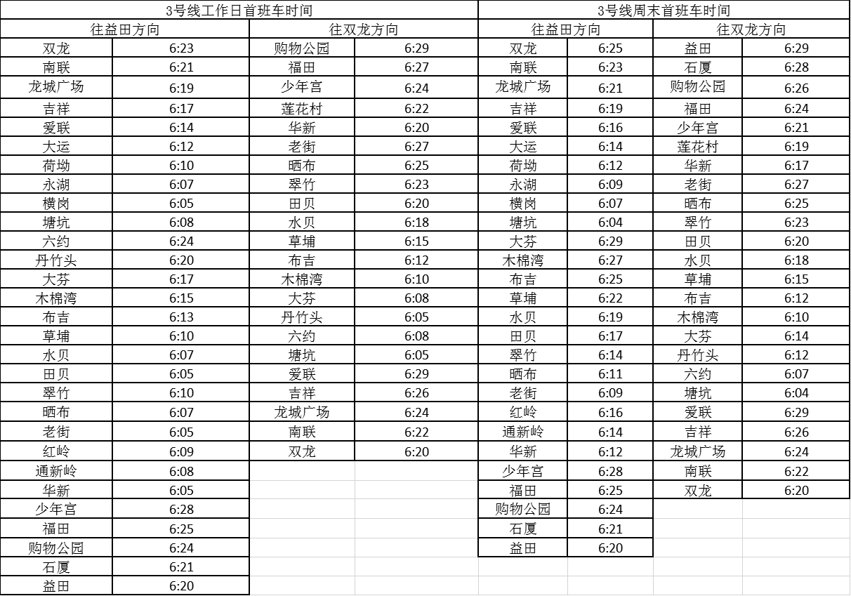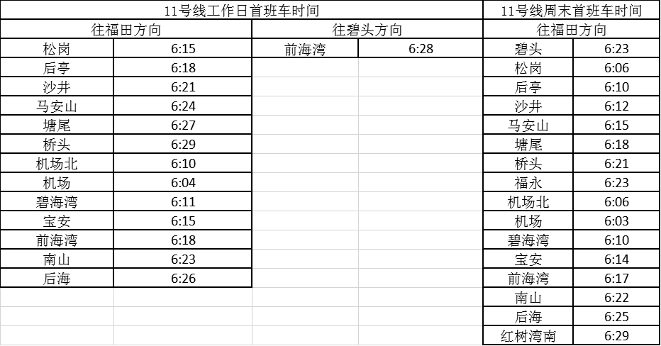 記者獲悉,經(jīng)優(yōu)化調(diào)整后,各線路工作日首班車最早發(fā)車站點(diǎn)及時(shí)間分別為,1號(hào)線老街站6:29、2號(hào)線蛇口港站6:14、3號(hào)線塘坑站6:05、5號(hào)線坂田站6:01、7號(hào)線赤尾6:09、9號(hào)線銀湖6:05、11號(hào)線機(jī)場(chǎng)站6:04。周末期間首班車最早發(fā)車站點(diǎn)及時(shí)間分別為,2號(hào)線香梅北站6:07、3號(hào)線塘坑站6:04、5號(hào)線長(zhǎng)嶺陂站6:00、7號(hào)線皇崗口岸站6:09、9號(hào)線孖嶺站6:05、11號(hào)線機(jī)場(chǎng)站6:03。