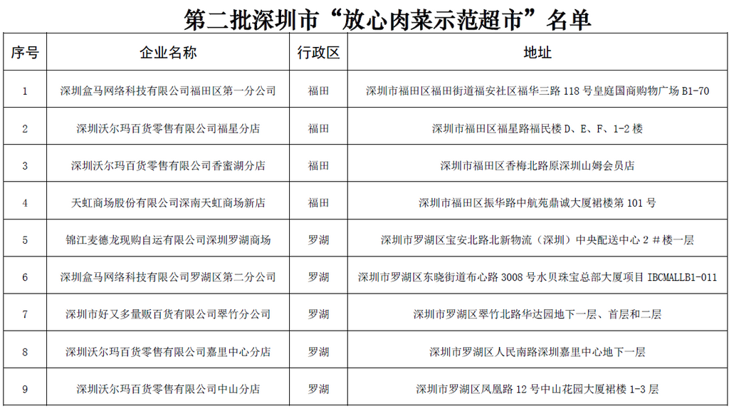 見圳客戶端?深圳新聞網2020年5月29日訊(見圳客戶端、深圳新聞網記者 劉夢婷 見習記者 唐麗玲)日前,深圳市市場監(jiān)督管理局(以下簡稱“深圳市監(jiān)局”)公布了2020年度第二批深圳市“放心肉菜示范超市”名單,盒馬、沃爾瑪、天虹等27家在深分店榜上有名。