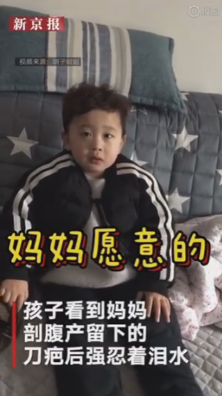 視頻中,孩子無(wú)意中看到媽媽剖腹產(chǎn)生他時(shí)留下的刀疤