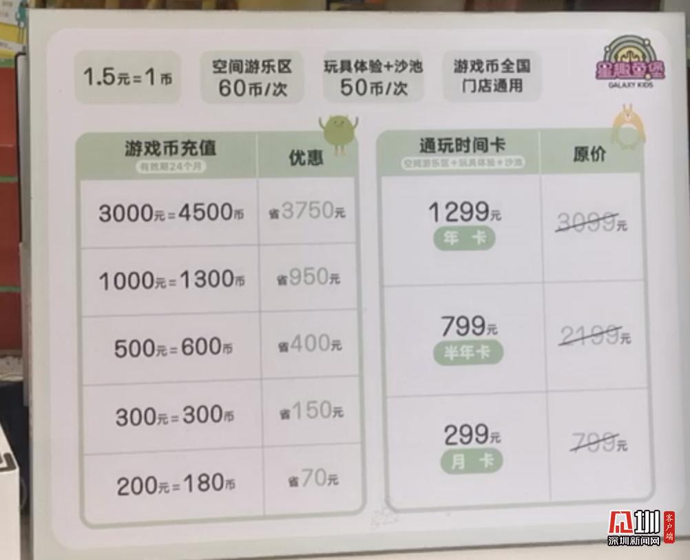 星際傳奇采用多場(chǎng)所差異化的收費(fèi)制度,每個(gè)項(xiàng)目?jī)r(jià)格均有不同,深圳新聞網(wǎng)記者從工作人員處了解到每位兒童的單次消費(fèi)均價(jià)在150元左右,陪同的大人免費(fèi)。有需要的市民也可以選擇辦理月卡或者是年卡,享受更大力度的折扣。游樂(lè)場(chǎng)內(nèi)部地面干凈整潔,有家長(zhǎng)休息區(qū),在前臺(tái)有充電寶租借。